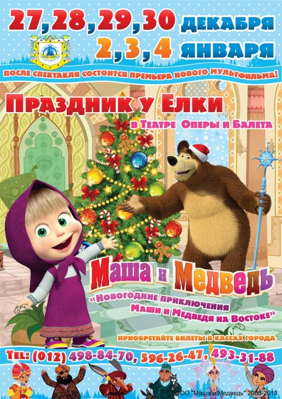 Dekabrın 27-dən 30-dək və yanvarın 2-dən 4-dək Azərbaycan Dövlət Akademik Opera və Balet Teatrında uşaqlar üçün “Maşa və Ayının Şərqdə yeni il macəraları” tamaşası göstəriləcək. Səhnə əsəri Azərbaycan və rus dillərində nümayiş etdiriləcək. Uşaqlar yeni ili Maşa və Ayı ilə birlikdə qarşılayacaq və bu, unudulmaz xatirəyə çevriləcək! 23.12.2013