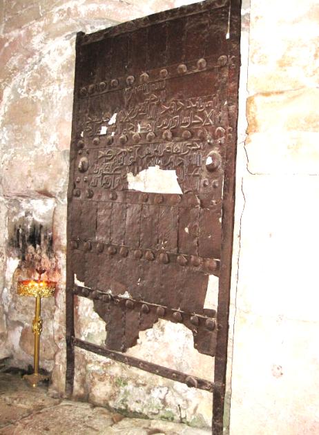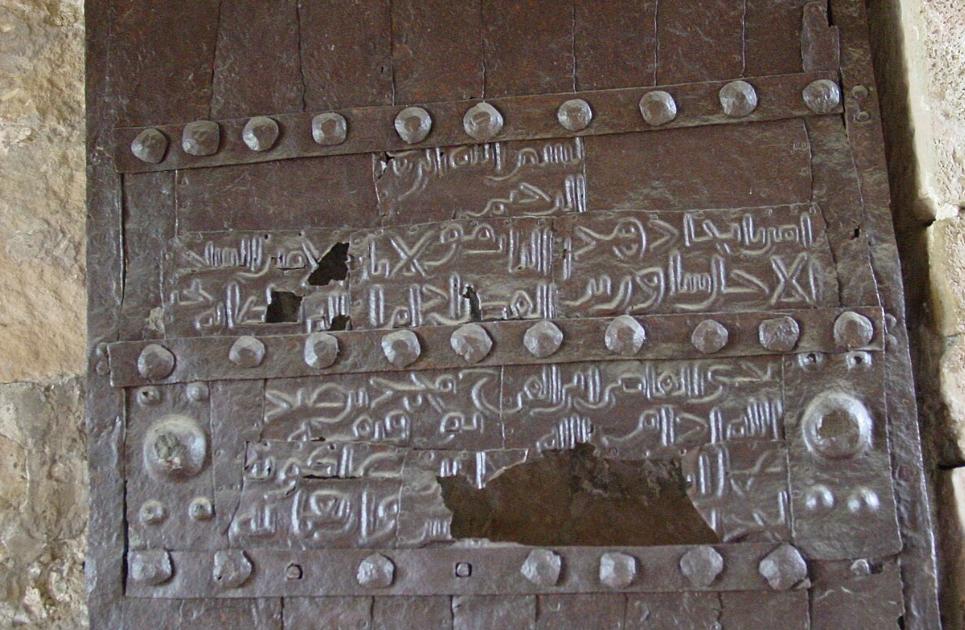 Qeyd edək ki, müəyyən bir hissəsinin eroziyaya uğramasına baxmayaraq darvaza olduqca təvazökar görünür. Kobud şəkildə metal təbəqələrdən haşiyələnmiş darvazanın üzərində ərəb əlifbası ilə bir yazı həkk olunub: “Rəhman və Rəhmli Allahın adı ilə! Böyük Rəbbimiz və Hökmdarımız Seyyid Şavur I ibn Əl-Fəzl - Allah ona uzun müddət hakimiyyət nəsib etsin — Qazi Əbül Fərəc Məhəmməd ibn Abdullahın — Allah ona uğur nəsib etsin — xeyir-duası ilə bu qapını tikməyi bizə əmr etdi. Dəmirçi İbrahim ibn Osman Ənqaveyhin işi. Hicrətin beşinci, əllinci və dörd yüzüncü ili (1063)”.