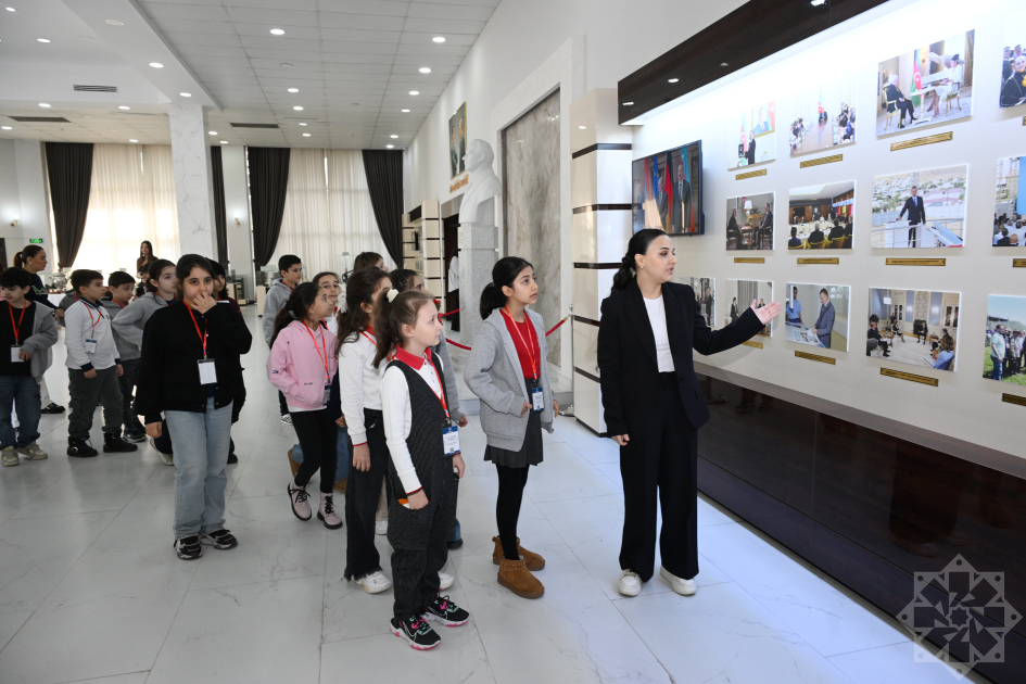 В здании Агентства ученики осмотрели фотостенды, на которых отображены кадры участия общенационального лидера Гейдара Алиева, Президента Ильхама Алиева и первой леди Мехрибан Алиевой в различных мероприятиях, интервью местным и зарубежным СМИ, обращений Верховного главнокомандующего к народу во время Второй Карабахской войны, посещений освобожденных от оккупации регионов, а также музей с образцами техники, использовавшейся АЗЕРТАДЖ в разные периоды.